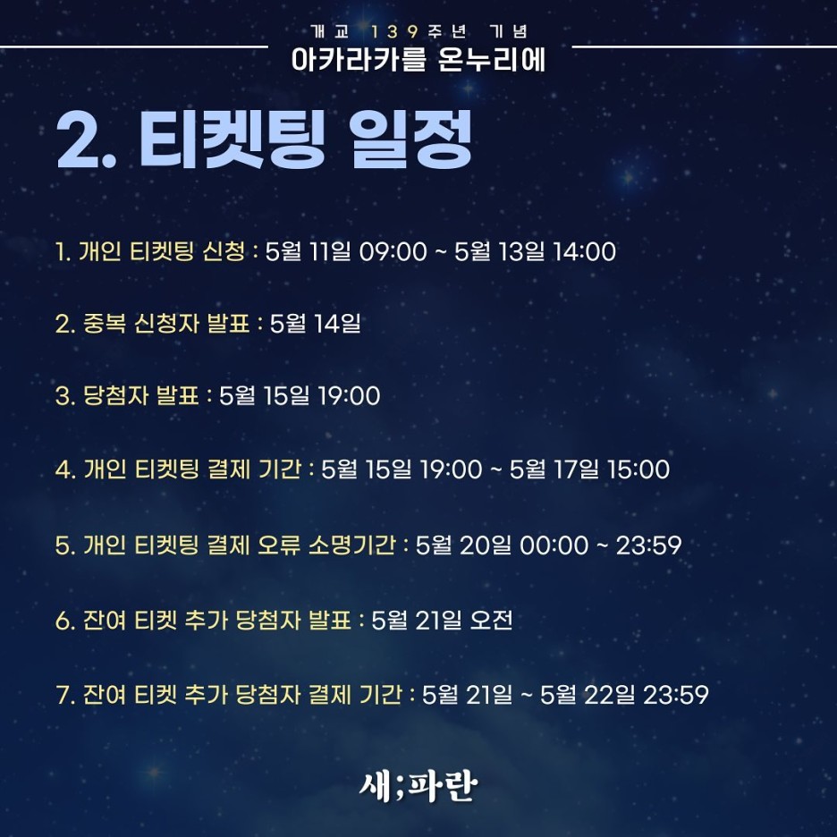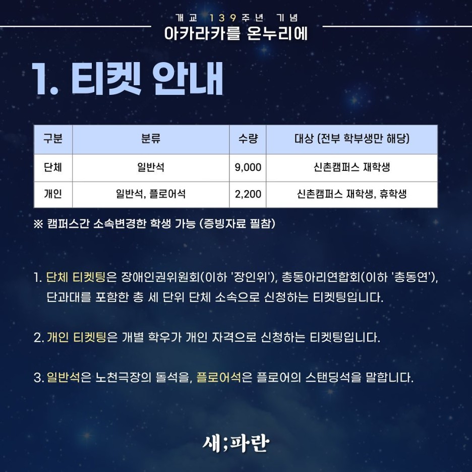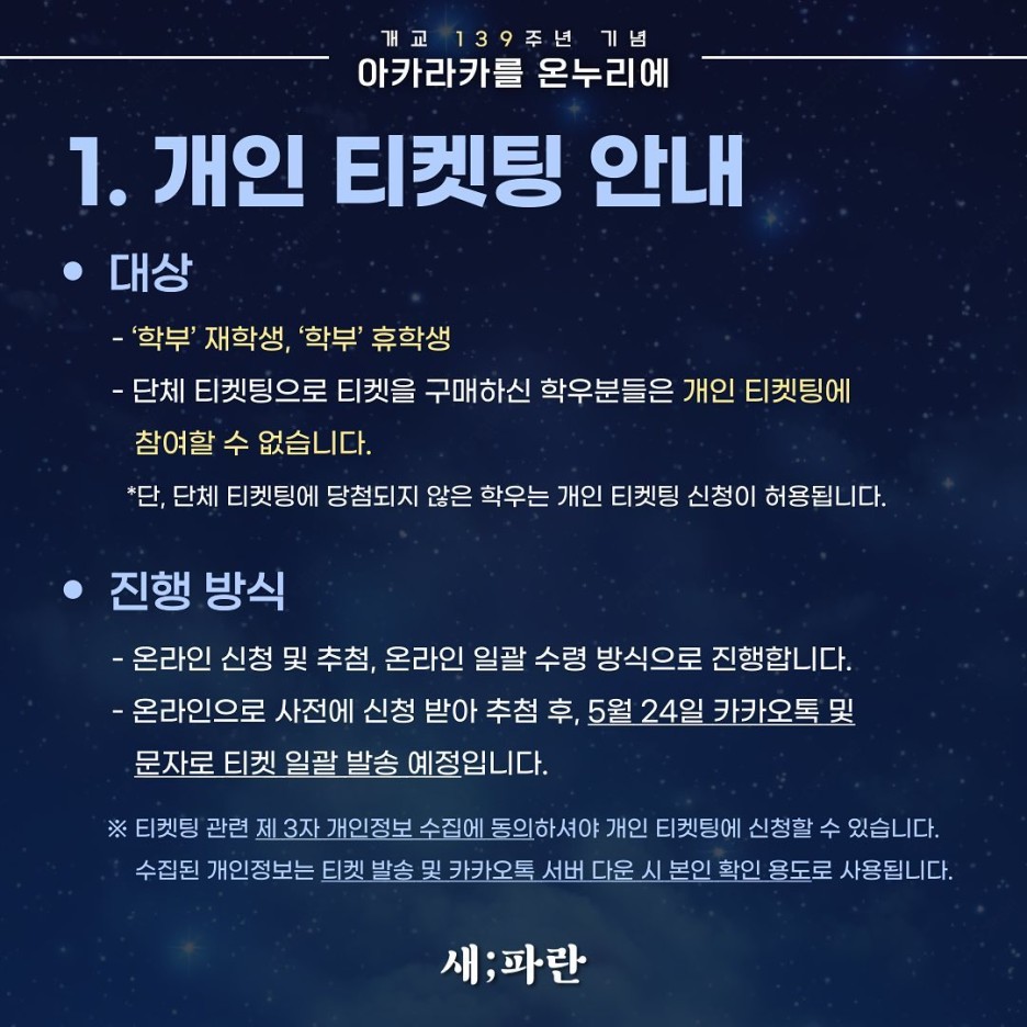 - 2024 아카라카 티켓팅 대상 : 연세대학교 신촌캠퍼스 학부 재학생, 학부 휴학생