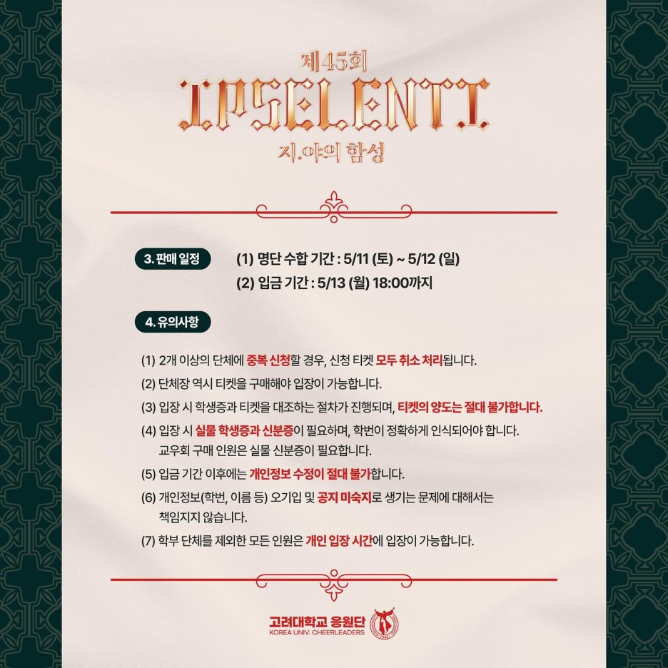 - 2024 입실렌티 티켓팅 대상 : 고려대학교 학부 및 일반대학원 재/휴학/수료생