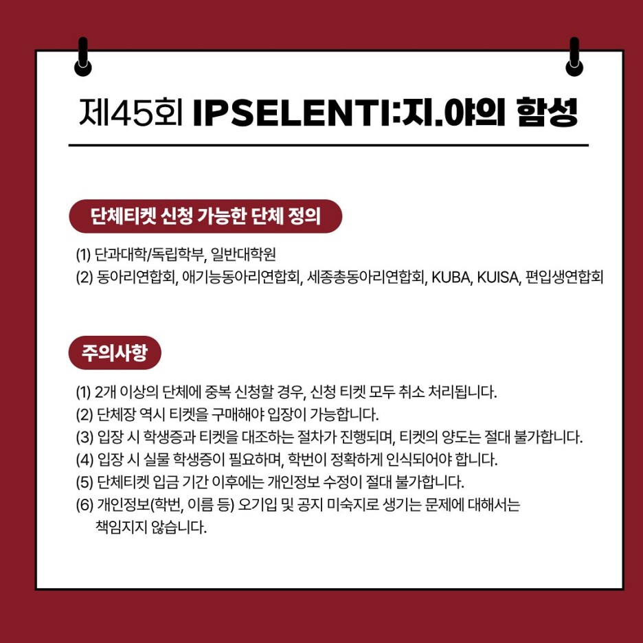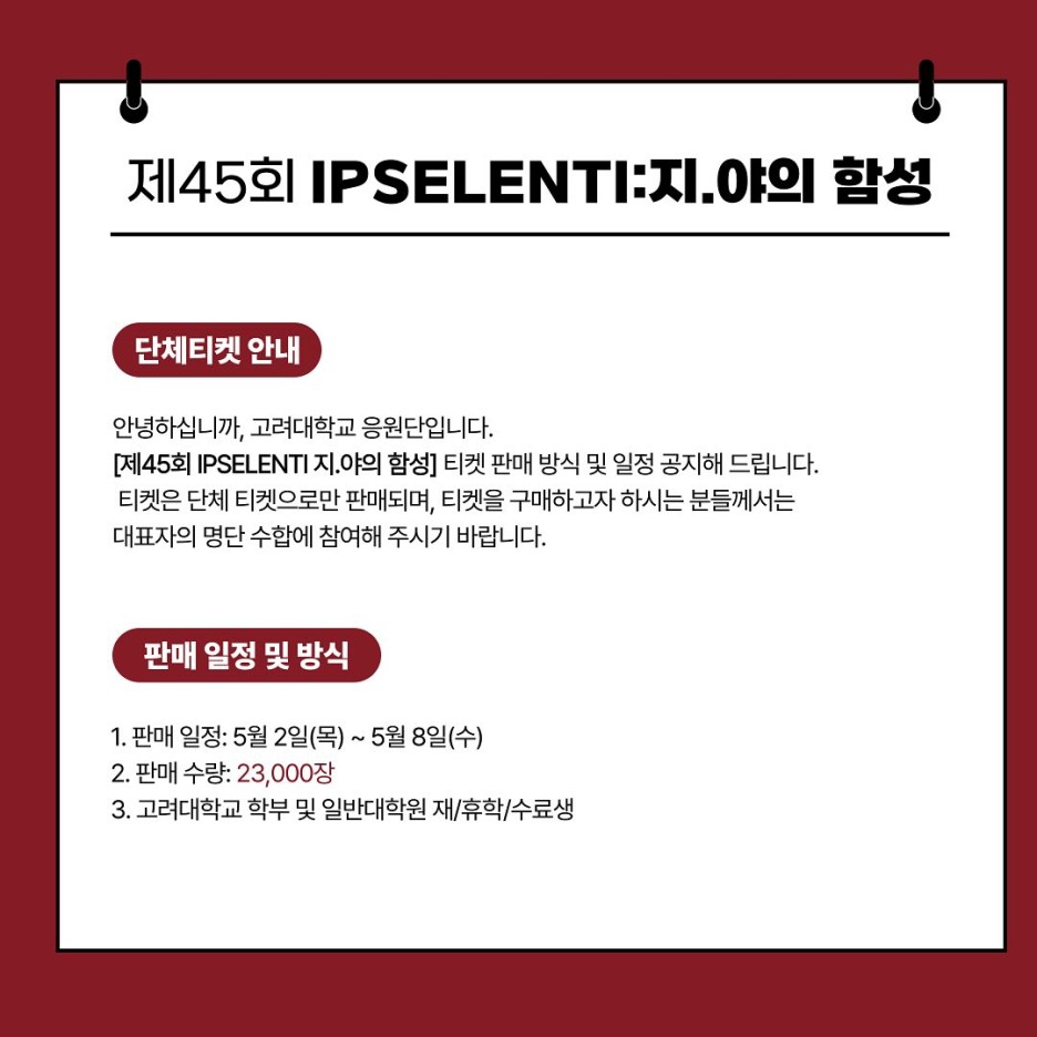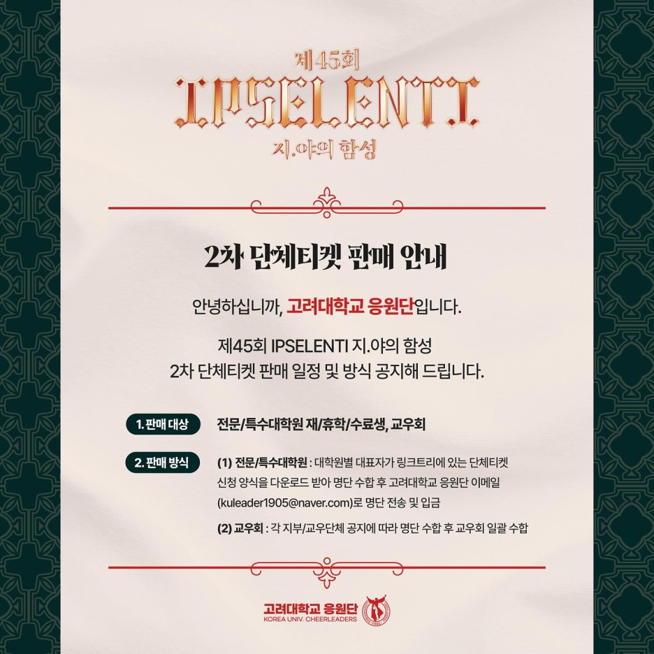 2024 입실렌티(IPSELENTI) 2차 티켓팅 판매 대상이 고려대학교 전문대학원 및 특수대학원 재/휴학/수료생, 고려대학교 교우회(졸업생)으로 한정되었기 때문에 일반인(외부인)이 2024 입실렌티 티켓을 구매하는 것은 불가능하다.