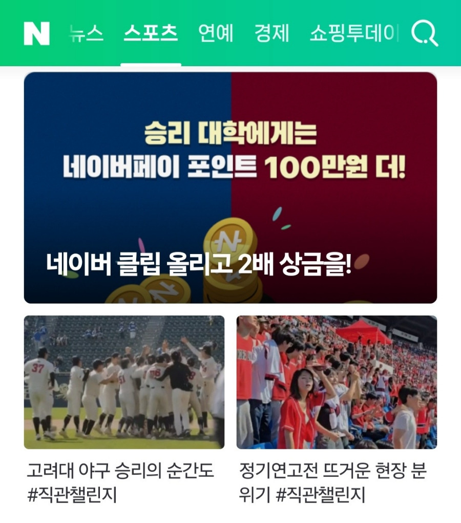 마침 네이버 스포츠에서 정기고연전(정기연고전) 직관챌린지 이벤트를 진행하여 고연전 야구 응원 영상을 촬영하여 네이버 클립에 올렸는데 네이버 메인에 채택되어 조회 수가 네이버 클립 영상 하나만으로 10,000이 넘었다!