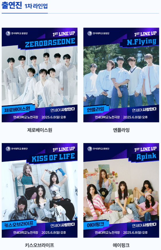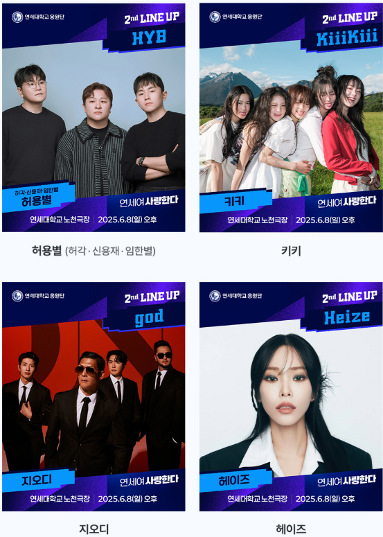 - 허용별(허각, 신용재, 임한별), 키키(KiiiKiii), 지오디(god), 헤이즈(Heize) : 2차 라인업 공개로 6월 8일 ‘연세여 사랑한다(속칭 2025 틀카라카)’ 참가.