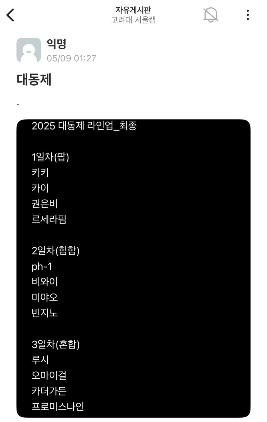 - 키키(KiiiKiii) : 아이브(IVE)가 2025 고려대 대동제에 참가했기 때문에 같은 소속사인 '키키(KiiiKiii)'가 입실렌티 라인업에 포함될 거라는 예상