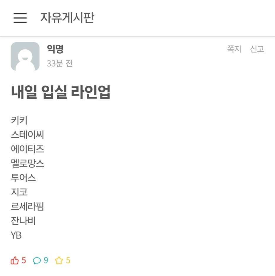 - 르세라핌(LE SSERRAFIM) [출처 : 에브리타임] : 약 한 달 전 본인이 방송국 관계자라면서 르세라핌이 입실렌티에 참가할 수 있다는 글이 올라왔음. 에브라타임 특성상 신뢰도가 높지가 않지만 아직 입실렌티 참가한 적이 없었던 여자 아이돌 그룹 중 하나