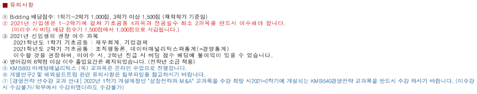 행정실에서 자세한 수강신청 일정과 유의사항을 보내주셨는데 하마터면 까먹을 뻔한 기초 공통 필수 이수! 기초 공통을 미이수할 경우 3학기(2학년) 때 Bidding 점수가 1,500점이 아닌 1,000점이기 때문에 전공필수나 전공선택 수강 시 500점만큼 비딩을 할 수 없기 때문에 불이익이 크다.