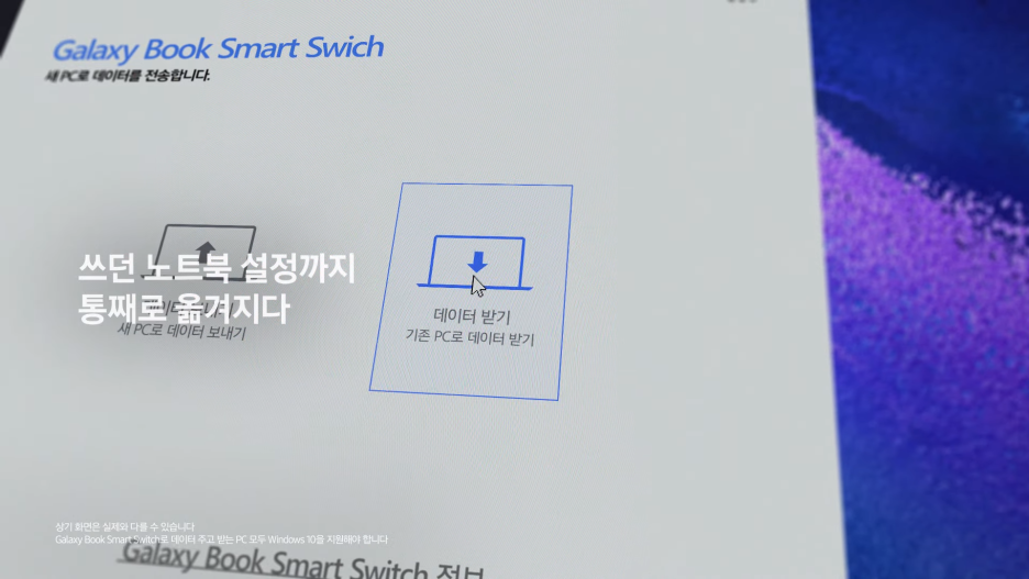 폰을 바꿀 때마다 다운로드해서 기존 폰에 있는 데이터를 새 폰으로 옮기는 그 스마트 스위치(Smart Switch)가 갤럭시 북을 지원한다! 기존 노트북에서 스마트 스위치(Smart Switch)를 설치하고 데이터를 전송하면, 새로 구매한 갤럭시 북에서 기존 노트북의 설정과 데이터를 그대로 받을 수 있다!