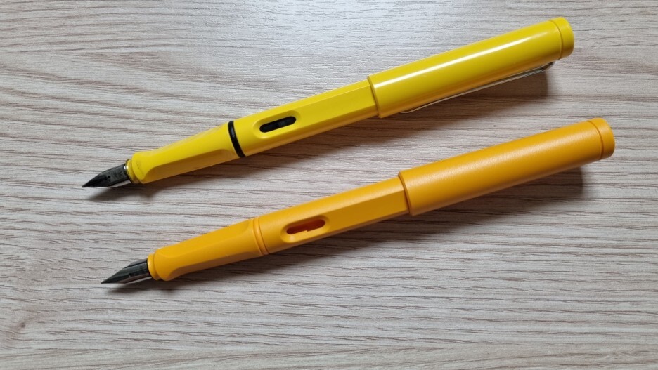 위 사진은 주인을 잘못 만나 고생 중인 라미 사파리 만년필 옐로우와 이번에 구매한 라미 사파리 만년필 망고의 비교샷!