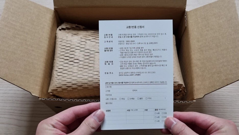 택배를 받자마자 무척 기분이 좋았는데 위 사진에서 볼 수 있듯이 누가 봐도 라미(LAMY)에서 제품을 구매한 것을 알 수 있게 전용 상자로 배송이 왔다. 상자를 여니 교환 반품 신청서와 제품이 상하지 않도록 잘 포장된 만년필을 확인할 수 있었다.