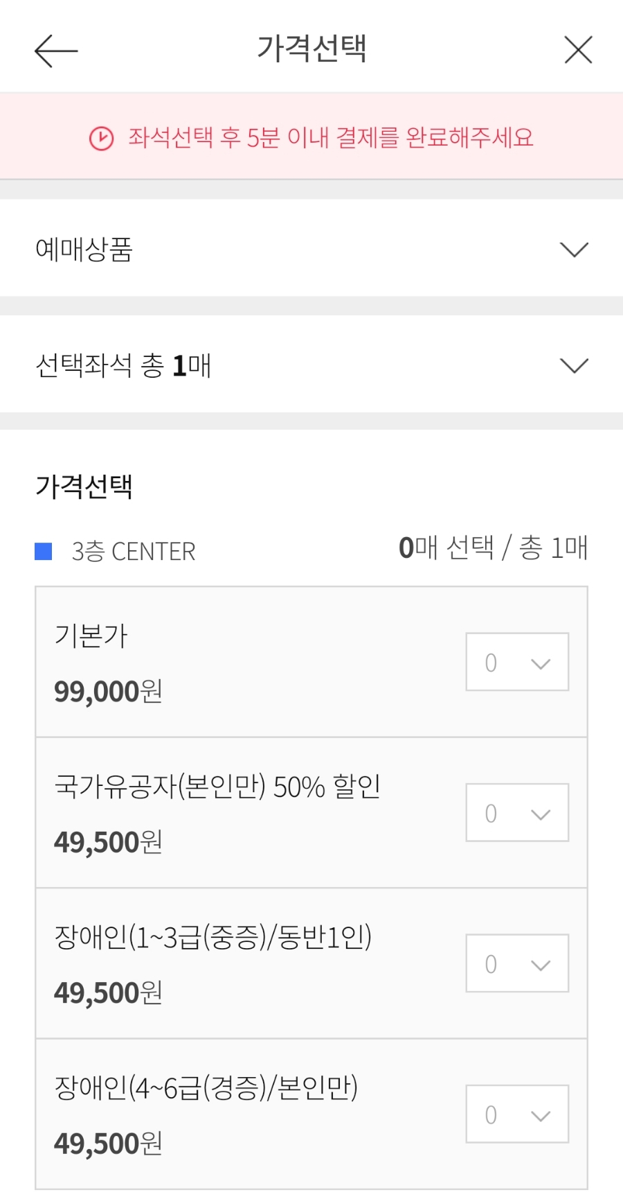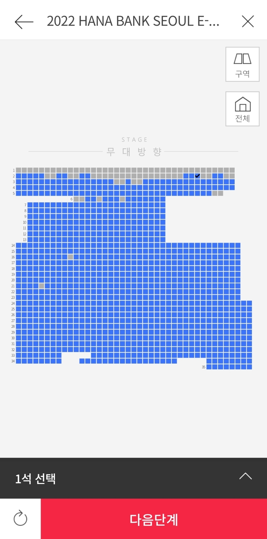 4. 구역 선택 → 좌석 선택 → 다음단계 → 가격선택 → 다음단계 → 결제수단 선택 후 결제하기